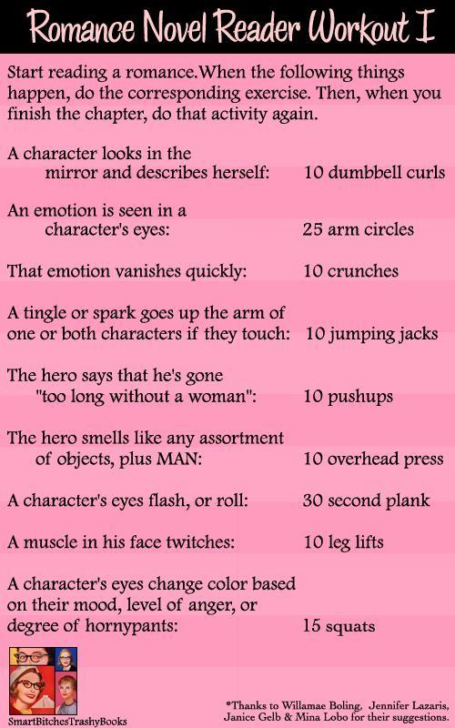Rather read a romance novel but know you should be getting a little exercise? Try this workout – or one of the sixteen others! – from Smart Bitches, Trashy Books. Guaranteed to give your abs a good laugh-out, at the very least!