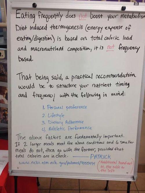 One place small meals can make a big difference, though, is blood sugar. You may hear someone say “I know it boosts your metabolism, because I feel way better when I have a lot of small meals.” Metabolism, no, but it can definitely smooth out your energy level, and that’s a good enough reason to eat that way. This is the kind of factor that the numbered list in the photo is getting at: