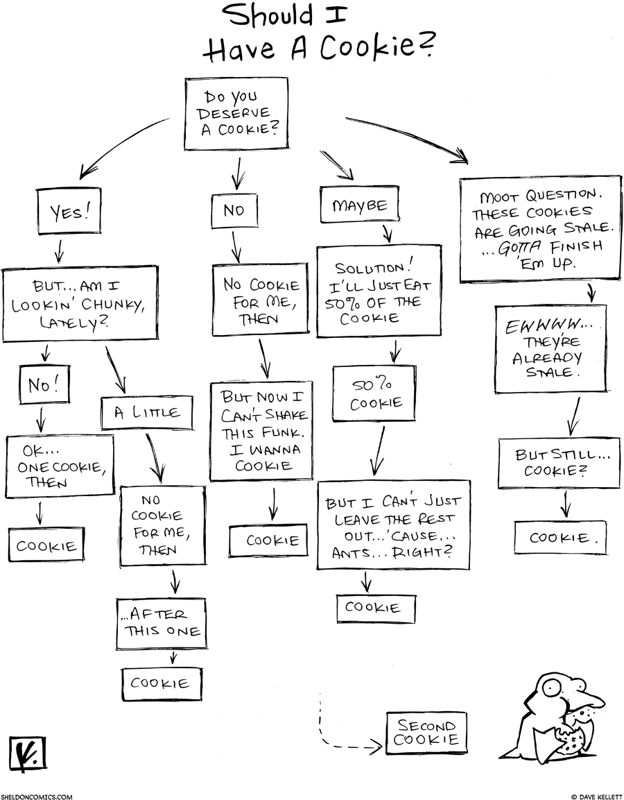 Sheldon asks a classic question — and illustrates the many ways we rationalize things when we think we shouldn’t be doing them. Note that once a bunch of work gets done to rationalize the cookie, the second cookie just happens. Worst-case scenario: you binge.