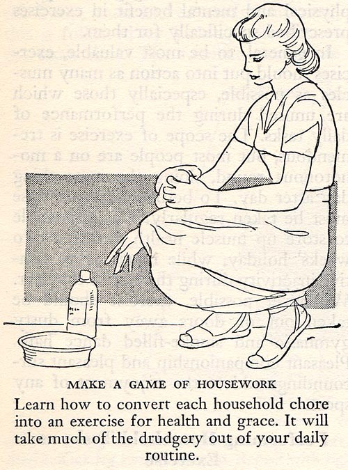 OK, this is kind of a sexist old-school illustration, but it works for everyone — men, women, and children. I am not convinced that it fully removes drudgery, but this approach, combined with the old standby “do one small thing whenever you get up” (or once an hour, and so on) can at least help you get some stuff done around the house and add some activity to your day in the process.