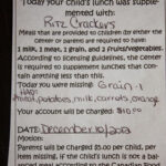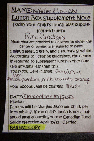 This image shows a note sent home from a daycare program to explain that the child’s home-made lunch was insufficient, and reminding the parent that there is a charge whenever the school supplements an insufficient home lunch. There’s just a couple of problems: the lunch was sufficient, and the school-provided “supplement” was junk calories — mainly fat and simple carbs, whereas the home-made lunch contained dense protein and fiber-rich foods).