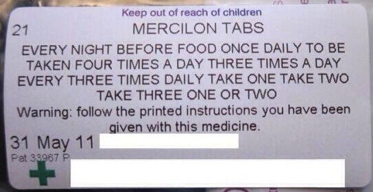 Fortunately most instructions aren’t this confusing, but sometimes instructions that are only spoken might as well be. It’s always OK to ask for confirmation, ask for written instructions, or call and ask questions later — whether the instructions came from your doctor (call the office and ask to speak to the nurse for the quickest answer), a nutritionist, a physical therapist, or a personal trainer.