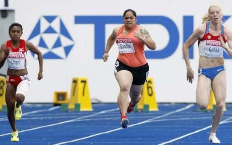 Sarah’s not an elite competitive athlete, but track and field championships, as well as the Olympics, regularly feature athletes who look like Sarah (or are bigger) — like the woman in the middle of this photo (from Getty Images), shot putter Savannah Sanitoa. After she missed the qualification mark in shot put in the Berlin World Championship in 2009, Sanitoa opted to take up the wildcard on offer in the 100m. She didn’t win, but she didn’t come in last, either.