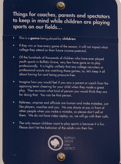 “Stage parents” have always been with us, but with some of the changes in how kids sports operate, some organizations have had to ask those parents to throttle back, please, like the Buffalo Grove Park District, which posted the sign above.