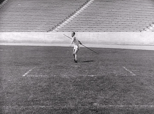 In this clip, from Buster Keaton’s “College,” we see a clearly strong and ripped Keaton throwing the javelin as hard as he can but barely making any distance. (This is a short clip of other track and field failures from the movie.)