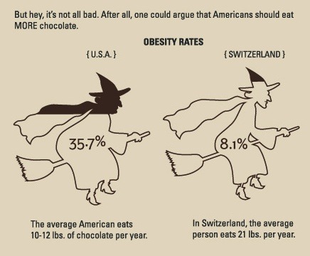 This is a detail from a Halloween Candy infographic at Livestrong.com. It makes and intriguing point! But Swiss people also walk close to twice as many steps as Americans, on average, and I’m sure there are other differences, too. (Why don’t we walk more, anyway? A series in Slate magazine a couple of years ago explores it.)