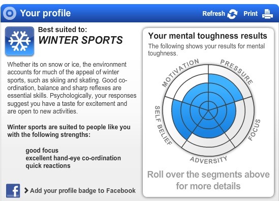 This tool asks you some questions about your interests and invites you to do a couple of skills tests (to test reaction time and coordination), and then it asks some personality questions. After it gives you your results, you can choose a “Getting Started” link to learn more about which sports it recommends for you and get “mini guides” that talk about them. (If you live in the UK, you can get information about nearby places to participate.)