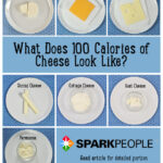 Here is another helpful visual for estimating portion sizes. This set of photos uses a plate 8.5 inches across (same as the short side of a standard sheet of paper). Go to the article to see LOTS more examples — for fruits, vegetables, meats, and grain-based foods. The article also has tables showing the weights of each of these servings — so you can see that 100 calories of cheddar cheese is packed into 1 ounce, but it takes 5 ounces of cottage cheese to get to 100 calories.